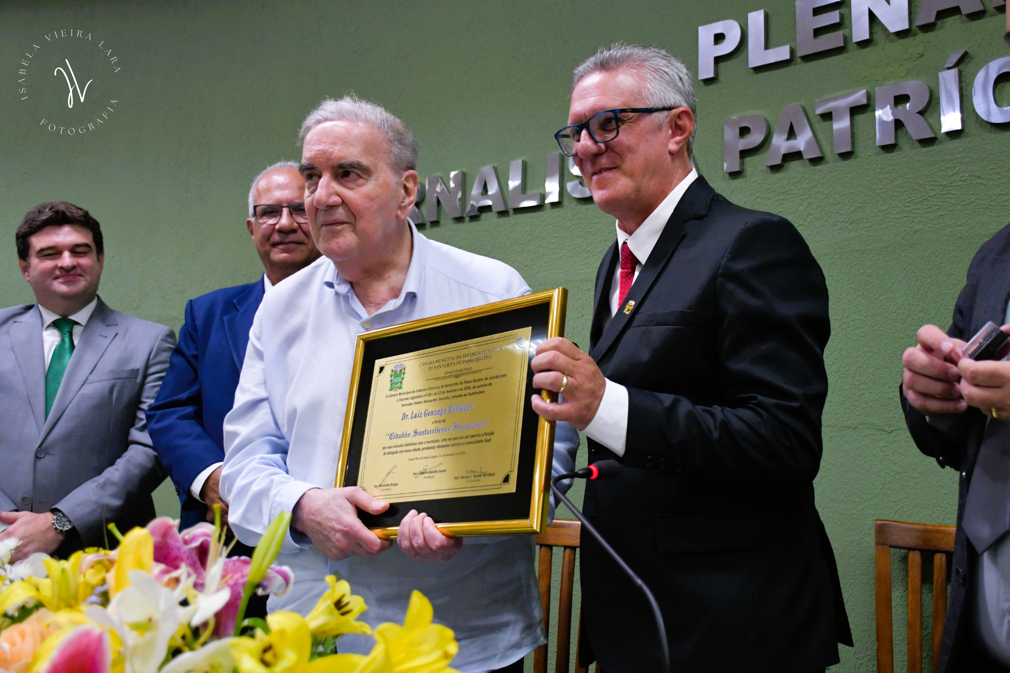 A Câmara Municipal da Estância de Santa Rita do Passa Quatro realizou Sessão Solene para a entrega do Título de Cidadão Santarritense Honorário ao Luiz Gonzaga Belluzzo, em reconhecimento à sua relevante trajetória profissional e aos vínculos históricos de sua família com o município.